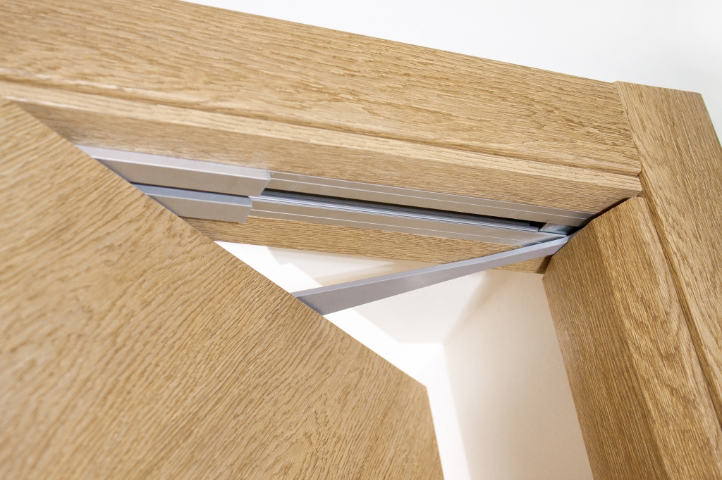 Теперь можно перейти к монтажу самой рото-двери. Для этого дверь вставляют в рельс и фиксируют с помощью встроенной фурнитуры. Для регулировки ширины коробки можно поступить стандартно – воспользоваться доборами. Собранный механизм следует смазать. В самом конце производится установка накладок и наличников.