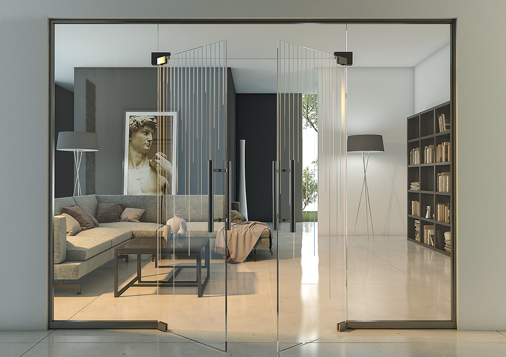 - отдельно стоят стеклянные двери. Они делаются из двух или трехслойного материала. Дополнительно изделия могут украшаться деревянными или стальными элементами. Сама дверь может быть прозрачной, глянцевой, иметь рисунок или быть однородной.